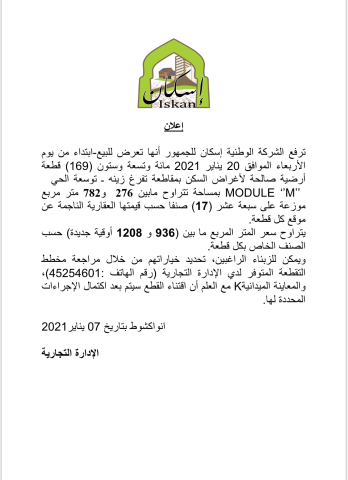 وقال إيجاز صادر عن الشركة إن الشركة قررت بيع 169 قطعة أرضة صالحة للسكن في توسعة الحي "M" MODULE.