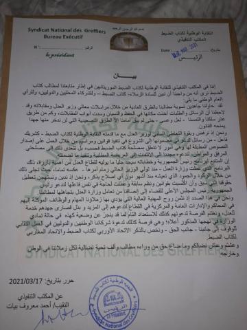 ونحن في هذا الصدد إذ نثمن روح المهنية العالية التي يؤدي بها زملاؤنا المهام والوظائف الموكلة إليهم في المحاكم والإدارات العامة والمركزية في القطاع لندعوهم إلى المزيد و بذل قصارى جهدهم خدمة للعدل، ونغتنم الفرصة لدعوتهم كذلك للاستعداد التام لما قد ينجرّ عن وضعية كهذه في حالة تمادي الوزارة في نهجها المذكور أعلاه؛ وهي فرصة كذلك لدعوة شركائنا الوطنيين والدوليين في العمل النقابي للوقوف إلى جانبنا - جانب الحق - ونخص بالذكر الاتحاد الأوربي لكتاب الضبط والإتحاد المغاربي لكتاب الضبط..
