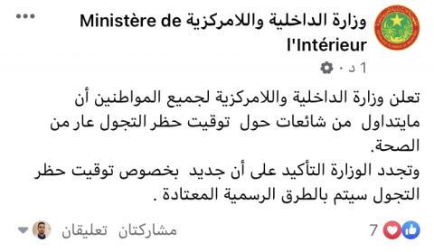 قالت وزارة الداخلية الموريتانية في منشور على حسابها بالفيسبوك إن مايتداول من شائعات حول توقيت حظر التجول "عار من الصحة".