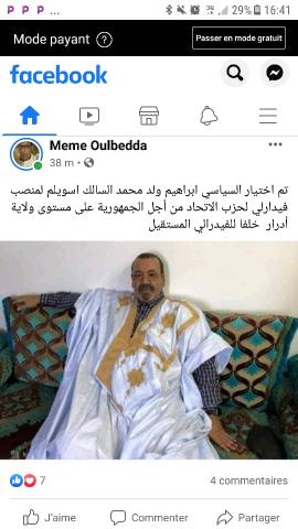 أعلن قبل قليل عن تعيين السياسي ابراهيم ولد محمد السالك اسويلم فيدراليا للحزب الحاكم في ولاية آدرار، خلفا لسيدن ولد سيد أحمد الذي أعلن استقالته.