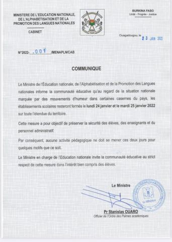 أعلنت السلطات في بوركينا فاسو، مساء اليوم الأحد، فرض حظر تجول ليلي على عموم البلاد ابتداء من ليل الأحد/الاثنين، بعد ساعات من إطلاق نار في ثكنات عسكرية قام به جنود غاضبون من ظروفهم ويطالبون بتجديد قيادة الجيش، وسط توتر أمني وسياسي تعيشه البلاد منذ عدة أسابيع.