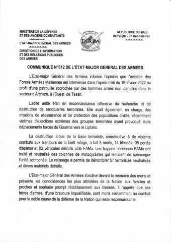 وأضاف البيان أن عملية تمشيط لمسرح الهجوم، الذي وقع في "قطاع أرشام غربي تسيت" بولاية غاو، مكنت من "إحصاء 57 إرهابيا تم القضاء عليهم، فضلا عن تدمير بعض المعدات".