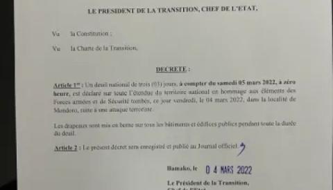 أعلنت الحكومة الإنتقالية في مالي عن حداد رسمي لمدة ثلاثة أيام بعد مقتل عشرات من جنودها في منطقة ماندورو خلال إشتباك عنيف مع الجماعات المسلحة الجهادية