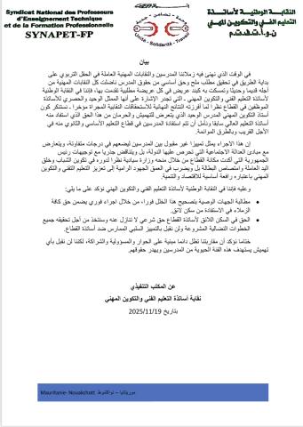 وقالت النقابة، التي تعد الممثل الحصري لأساتذة القطاع وفق نتائج الانتخابات النقابية الأخيرة، إن هذا الوضع يتعارض مع مبادئ العدالة الاجتماعية، ويتناقض مع التوجيهات العليا الداعمة للتعليم التقني والتكوين المهني ودوره في تأهيل الشباب وامتصاص البطالة، مؤكدة أن أساتذة التعليم العالي سبق أن استفادوا من هذا الحق، ومتطلعة إلى استفادة مدرسي التعليم الأساسي والثانوي منه قريباً.
