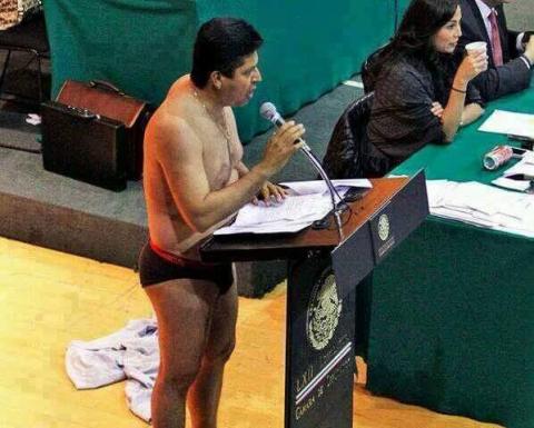 احتج برلماني مكسيكي تحت قبة البرلمان علي ما أسماه الفساد المعشعش في بلاده وكان ذالك في جلسة رسمية حضرها بعض اعضاء الحكومة وفضائيات محلية وعالمية حيث خلع ملابسه بالكامل ووقف على المنصة للتحدث امام البرلمان